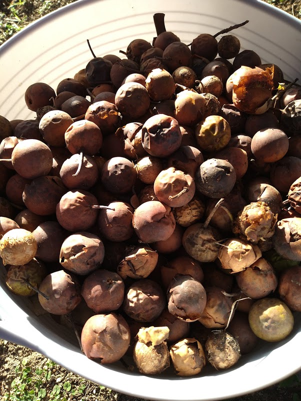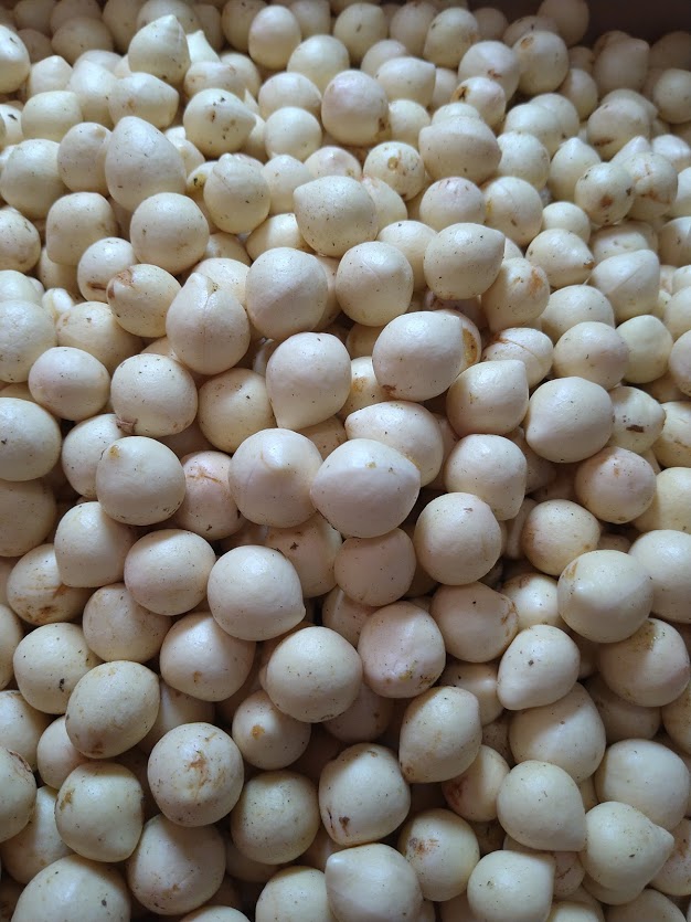 そして実割り作業へ。褐色に色づいてしわしわになった外皮の下にはかたいコルク質、その中にクリーム色をしたすべすべの核があります。