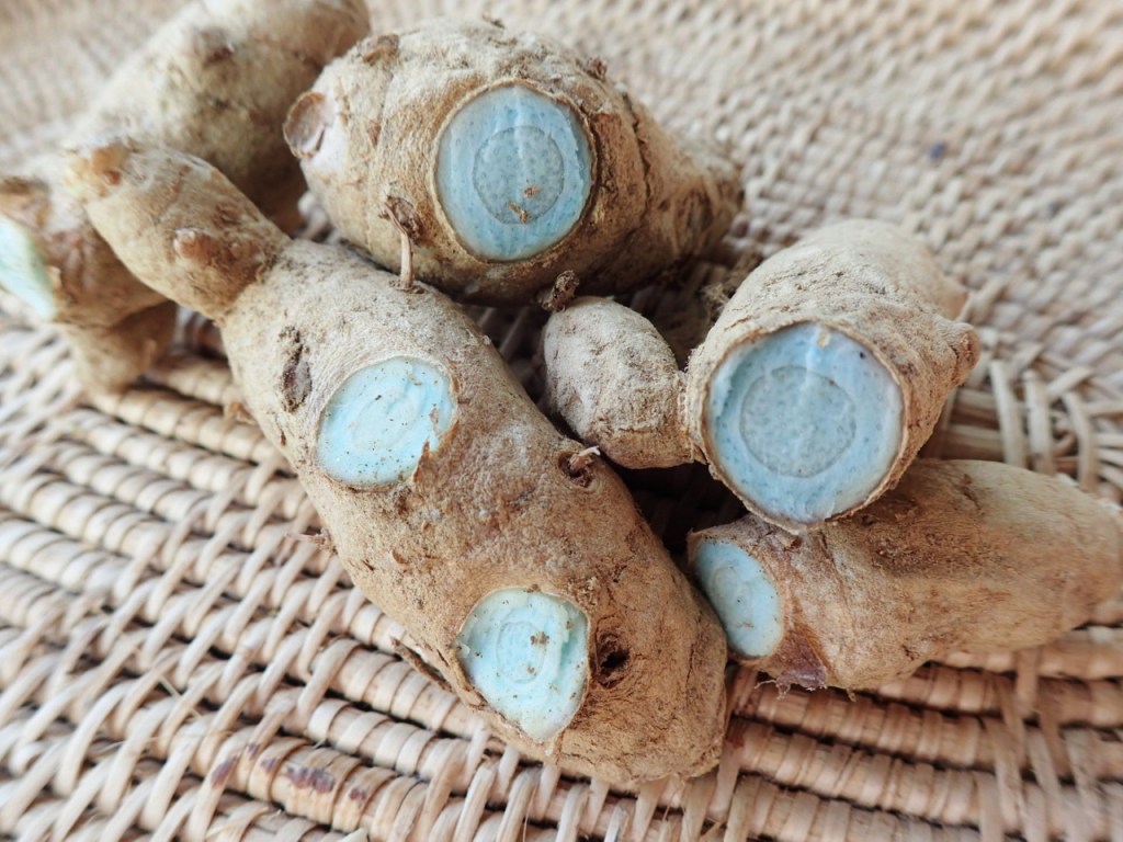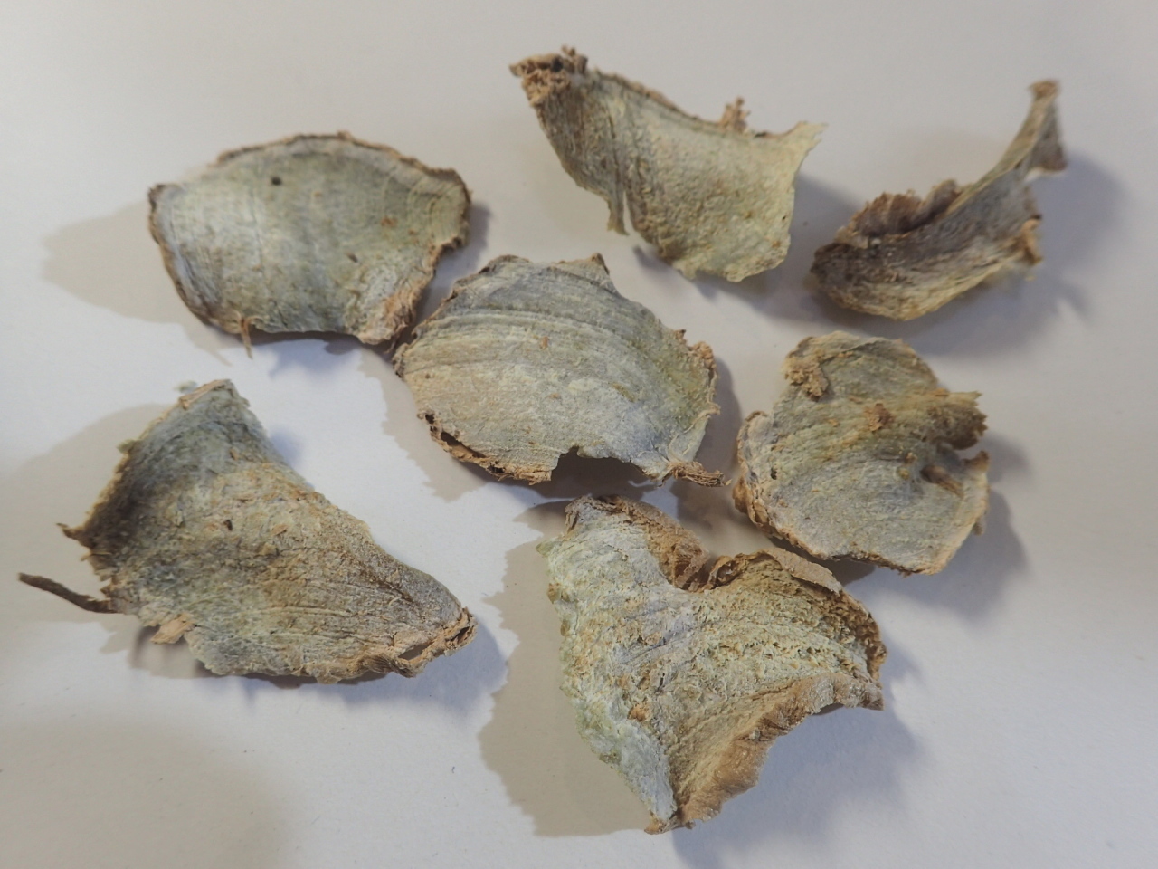 秋ウコンや春ウコンに豊富な黄色い成分クルクミンは含有していませんが、シネオール、カンファ―などの精油成分が豊富。『原色和漢薬図鑑』によると、芳香性健胃作用、胆汁分泌促進、興奮(刺激活性)、駆風(胃腸内のガスを排出)、鎮痛などの効果が期待され、消化不良や疝痛、経閉(閉経)などに応用するとあります。リン、カリウム、鉄、カルシウム、マグネシウムなどのミネラルも豊富。