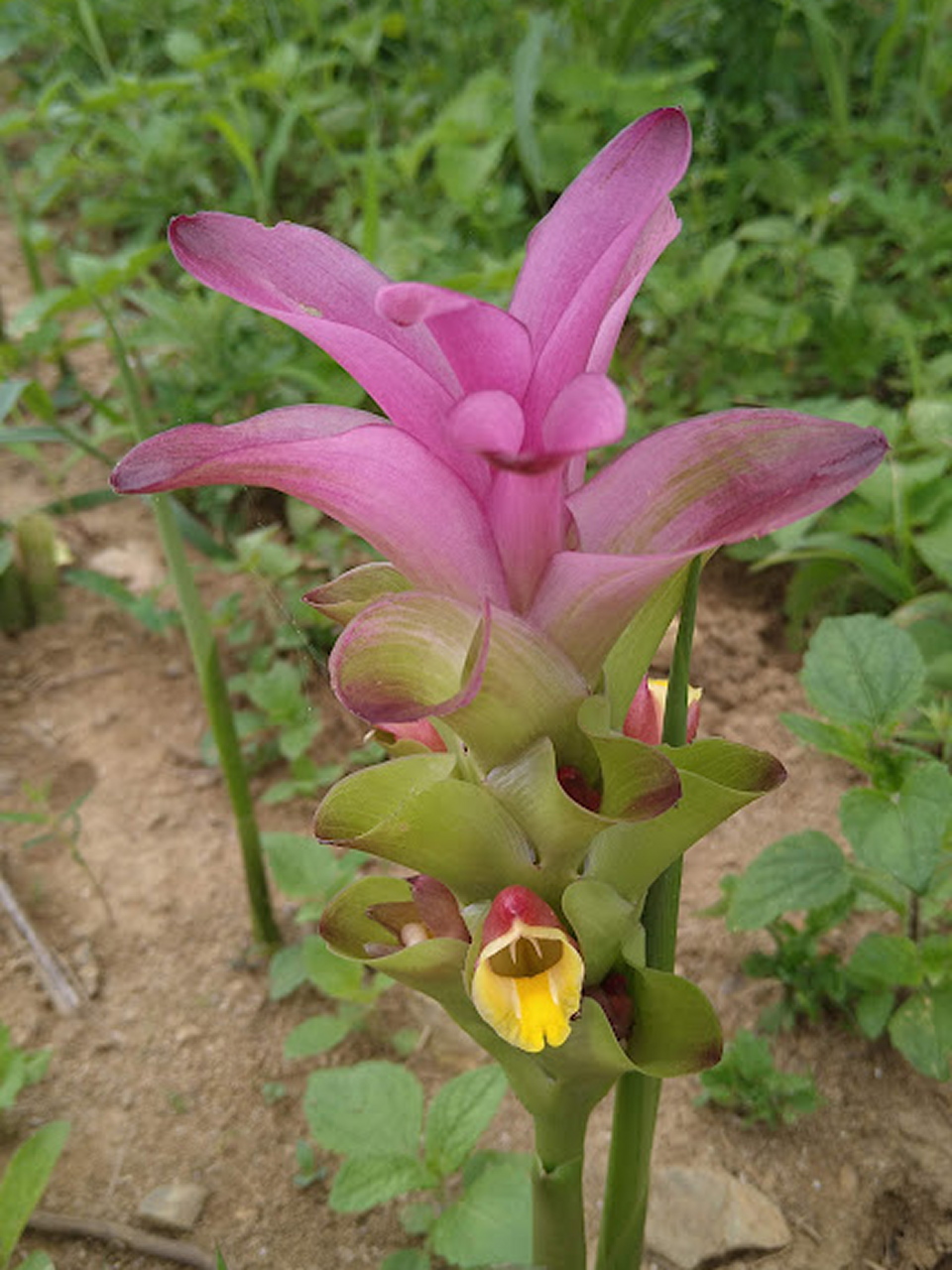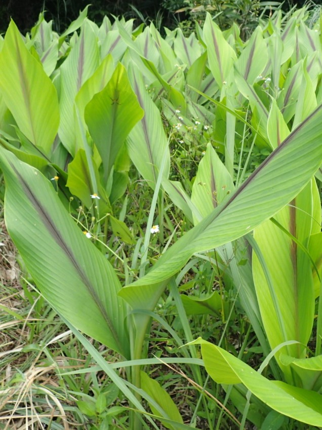 「ダイエットにおすすめ」とテレビで紹介され、若い女性の間で人気が高まっている紫ウコン(ガジュツ)。ショウガ科でヒマラヤ山東部原産、学名はCurcuma zedoaria Roscoe 。葉に紫色の斑が入っていることから紫ウコンと呼ばれ、春に濃いピンクの花(実際は苞。苞の間から咲く黄色い唇型が本当の花)を咲かせます。断面は薄い水色をしています。