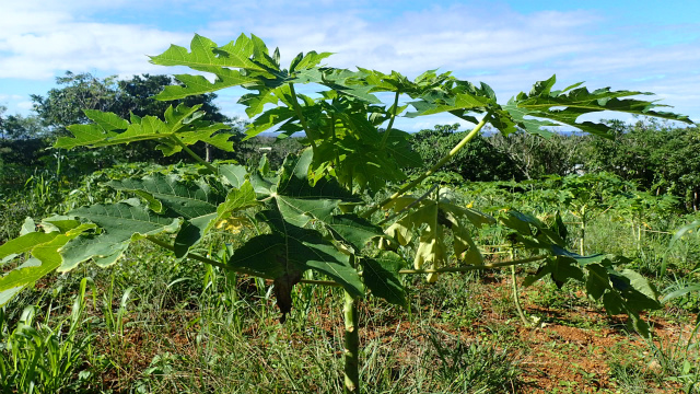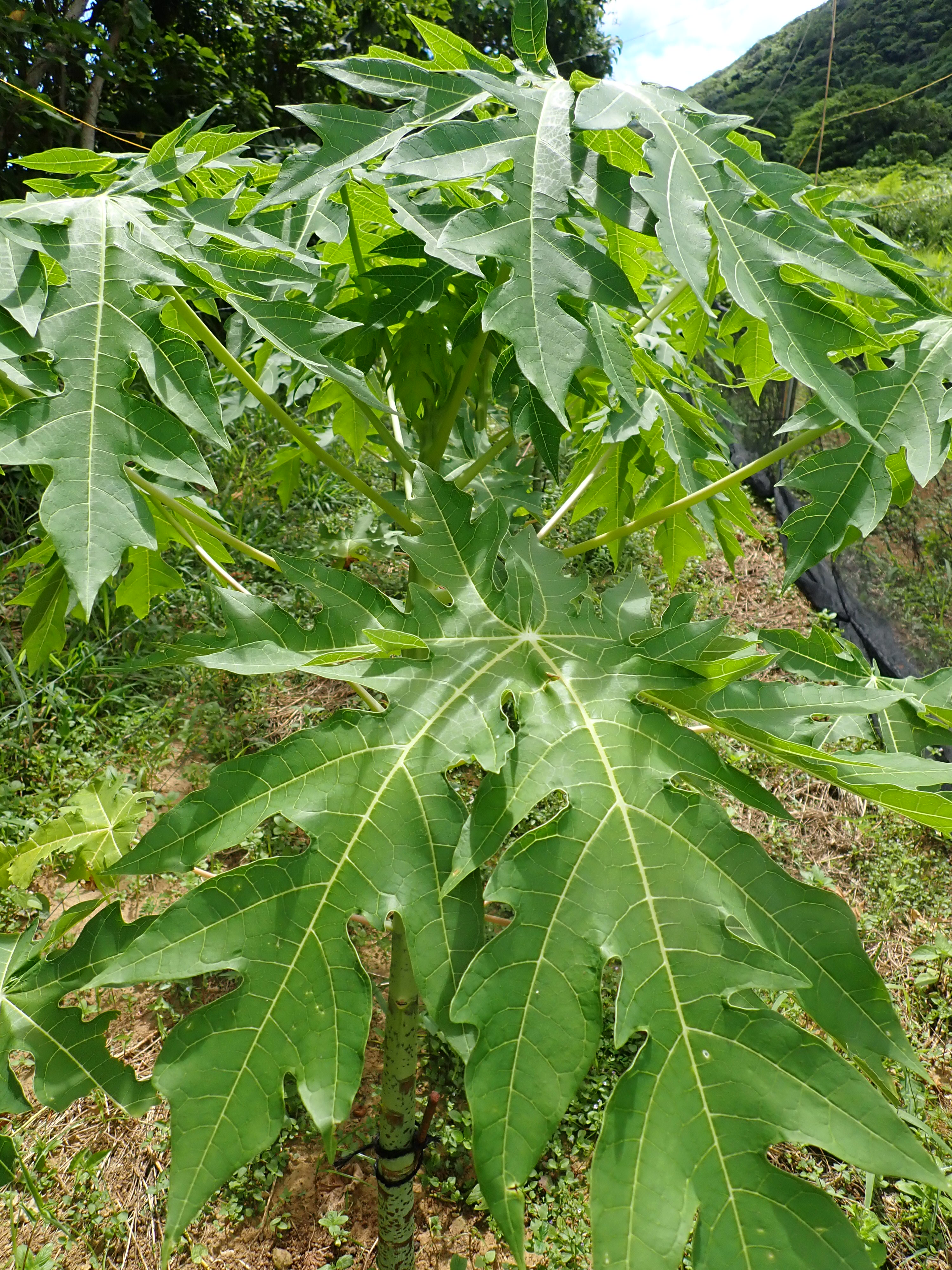 なうひあではハウスではなく、農薬や化学肥料を使わずに山の畑での露地栽培。小さい苗はクジャクの大好物で、油断すると葉を全部食べられてしまいます💦 いかに苗をクジャクから守るか、知恵をしぼって苦心しています。クジャクは雑食性、賢くもパパイヤの消化力に気づいているのでしょうか。