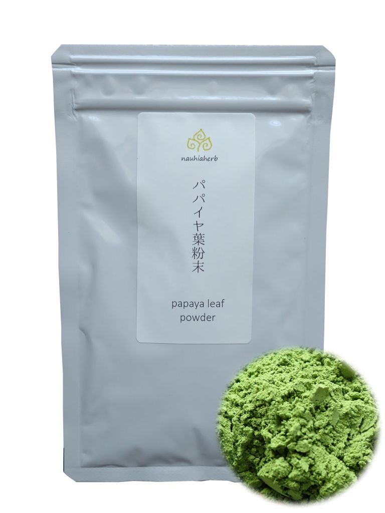新鮮な葉を水洗いのみであく抜きはせず、低温で乾燥・粉末加工しておりますので、鮮やかな緑色のパウダーに。青パパイヤに含まれるパパイン酵素もそのままに取り入れられます。緑茶の青草度をやや高くしたようなフレッシュな味で、ホットでもアイスでもおいしくいただけます。コツは多く入れ過ぎないこと。
