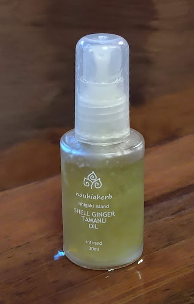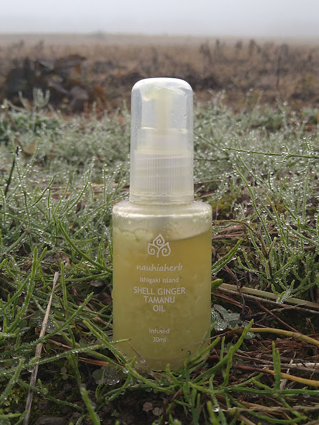その100%ピュアタマヌオイルに月桃の葉をつけ込んで有効成分を抽出し、さらに月桃精油も加えて香りよく仕上げたのが 石垣島月桃タマヌオイル。